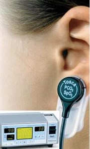 Continuously measure SpO2 and tcpCO2 with a single sensor on earlobe.